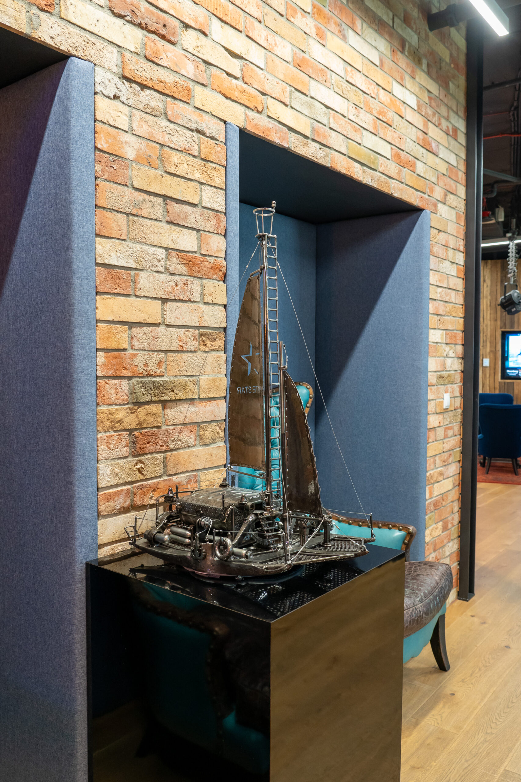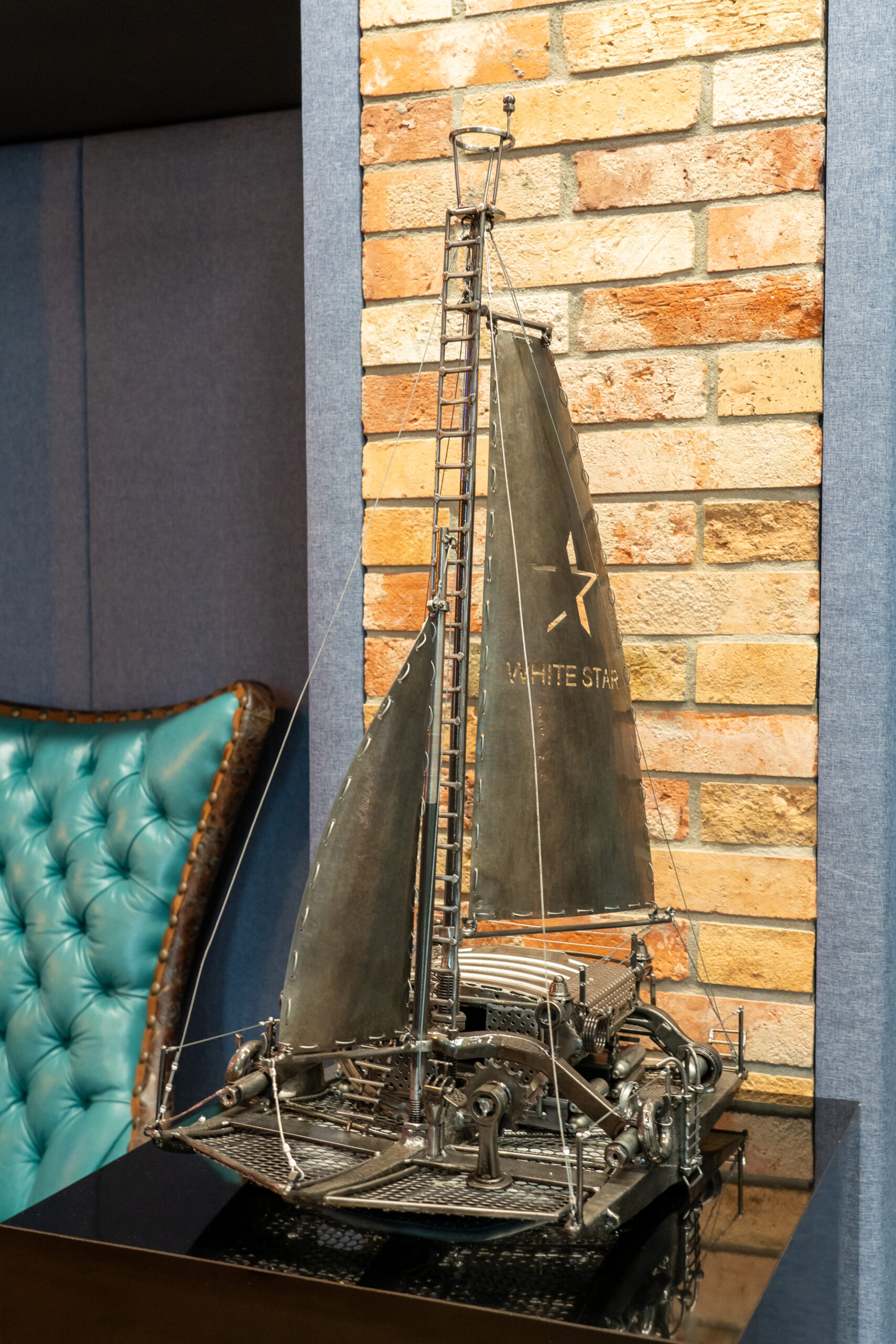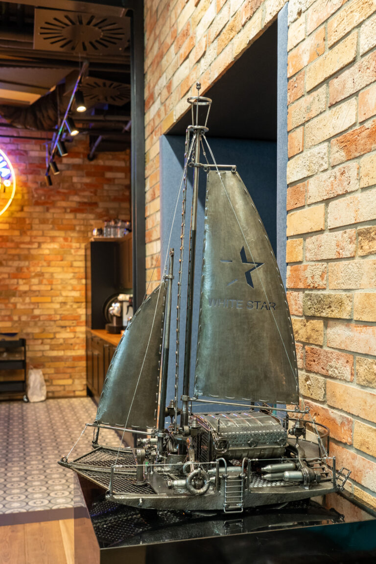 Rzeźba wykonana dla White Star Real Estate metodą spawania, materiał to 100% stal czarna, głównie złom, kadłuby wykonane są z kilofów a konstrukcja z końcówek drążków kierownicy.